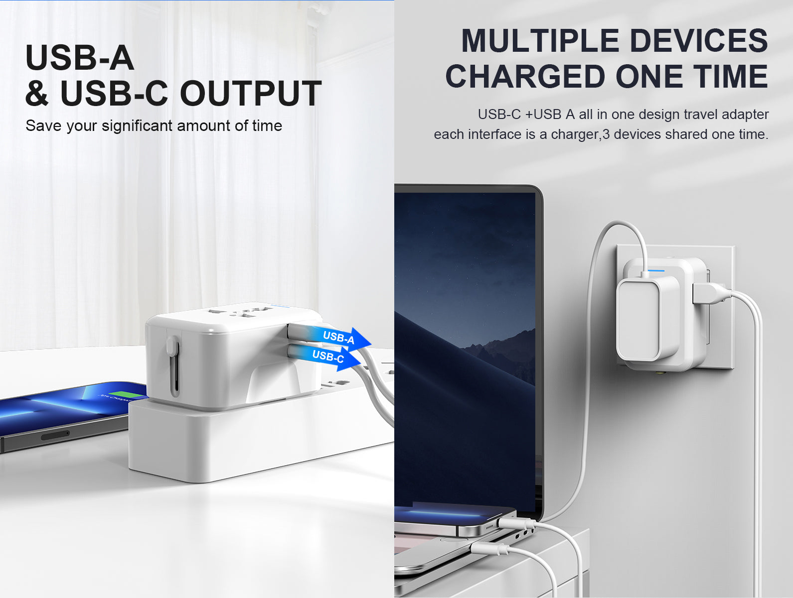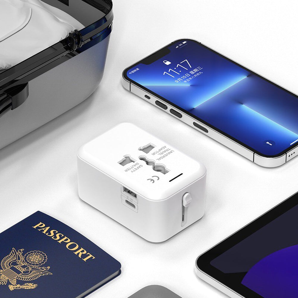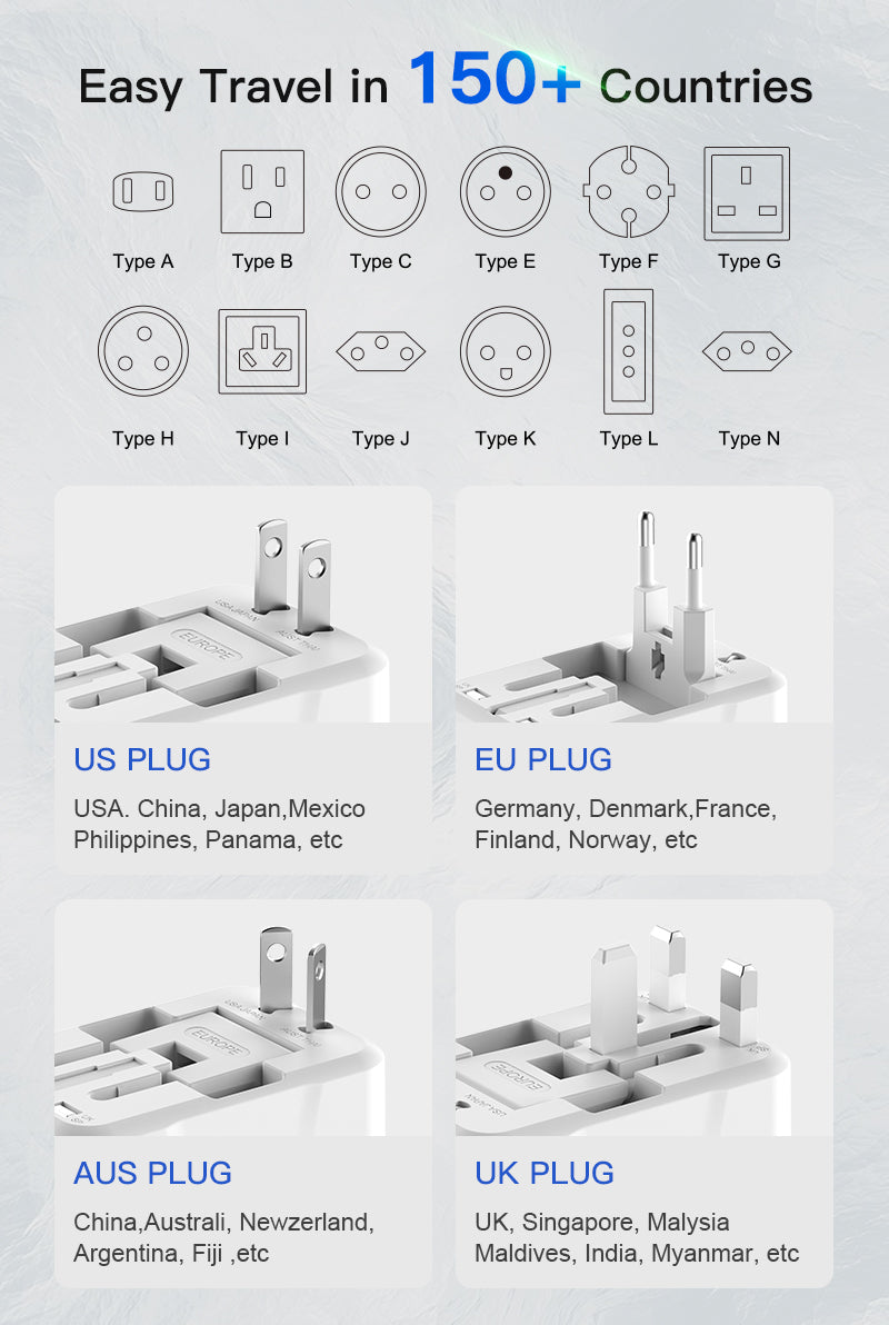 Compact 12.5W travel adaptor with US, EU, UK, and AU plugs. Compatible with 150 countries for seamless device charging.