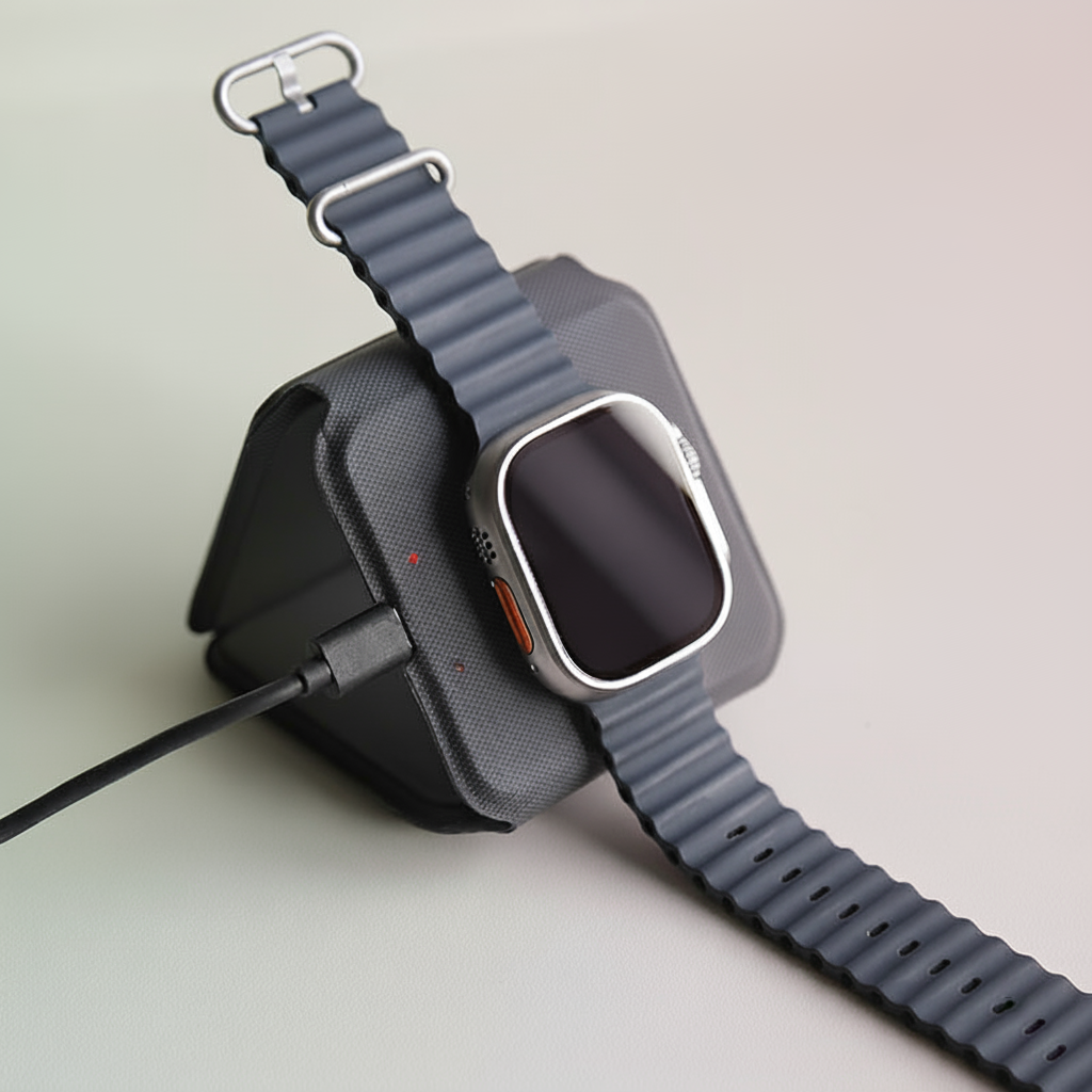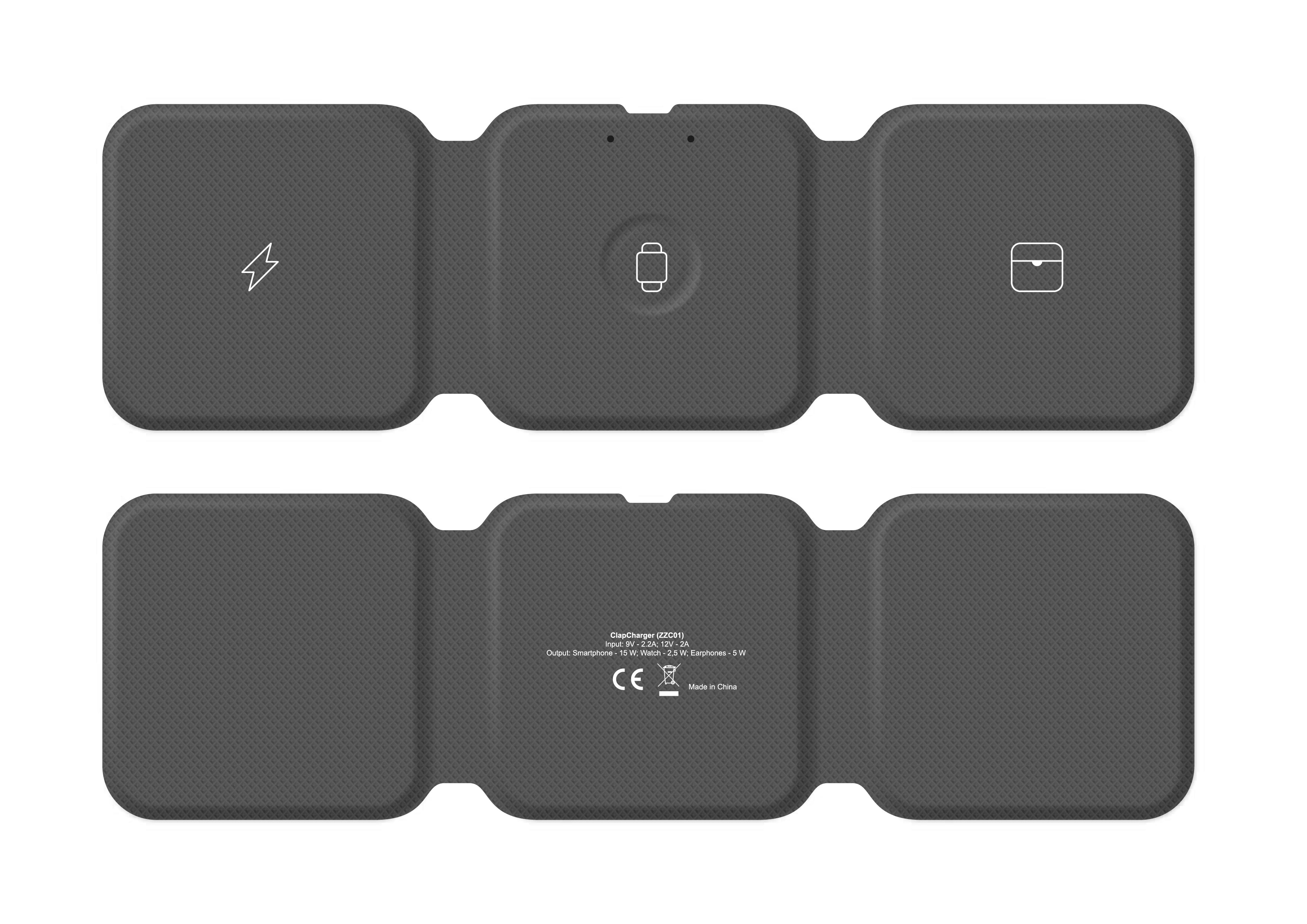 Compact 3-in-1 foldable wireless charger for phone, smartwatch, and earphones. Elegant PU finish with included pouch ideal for travelers.