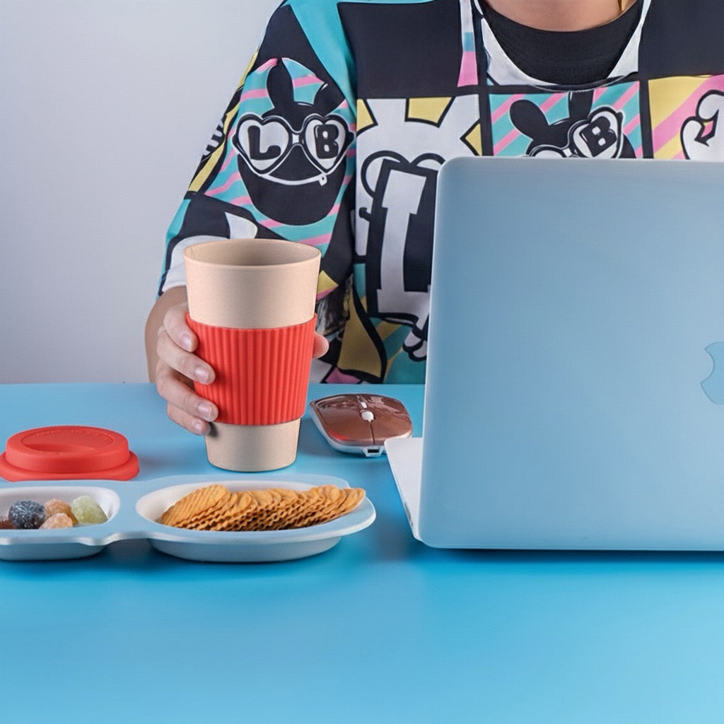 Eco-friendly 400ml bamboo fibre mug with colourful silicone lid and sleeve, crafted to FDA standards for safe, sustainable everyday use at home or on the go.