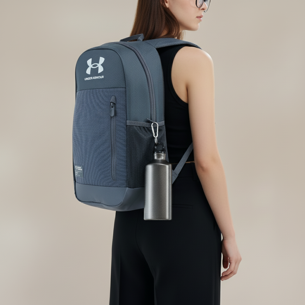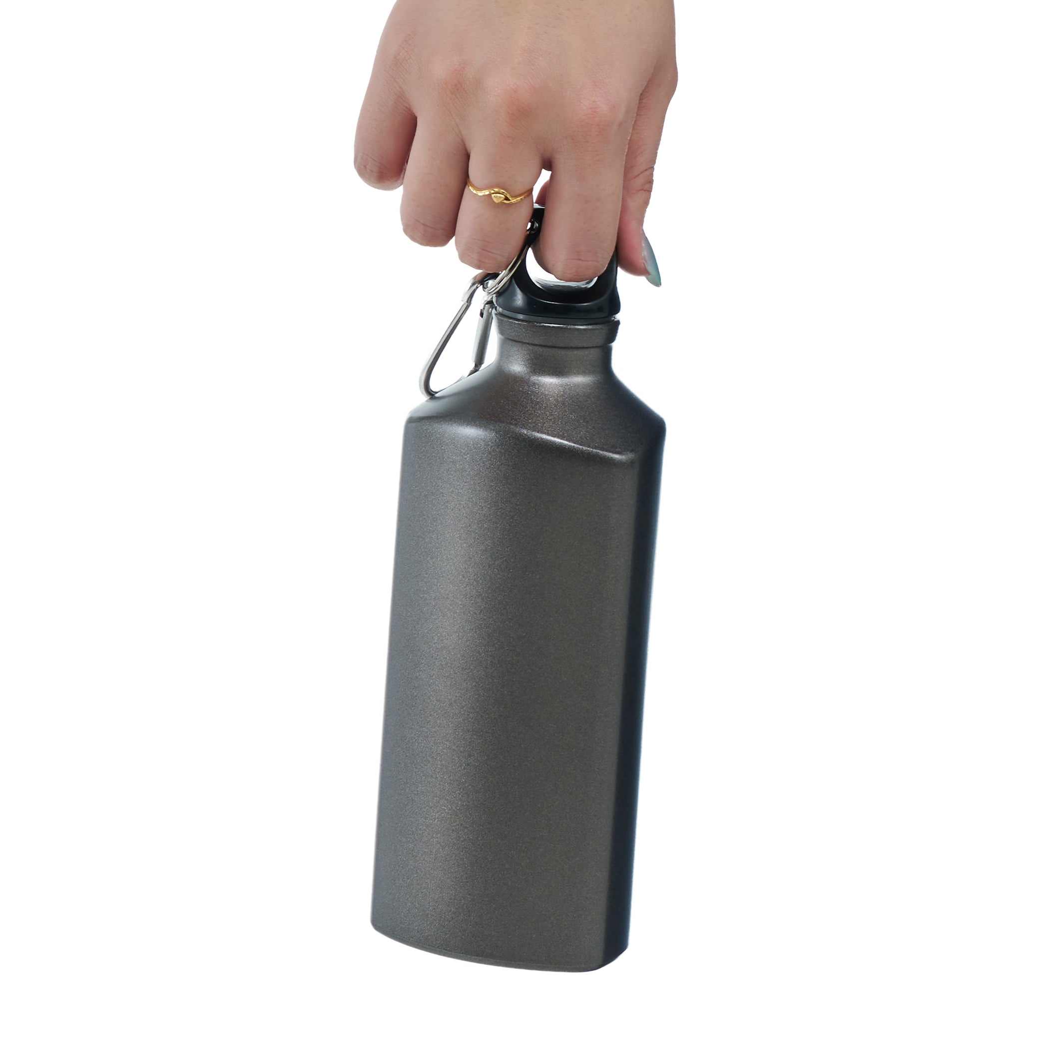 Sleek 600ml aluminum bottle with a matte metallic finish, featuring a twist lid and carabiner hook for easy attachment. Lightweight, durable, and BPA-free for safe everyday hydration.