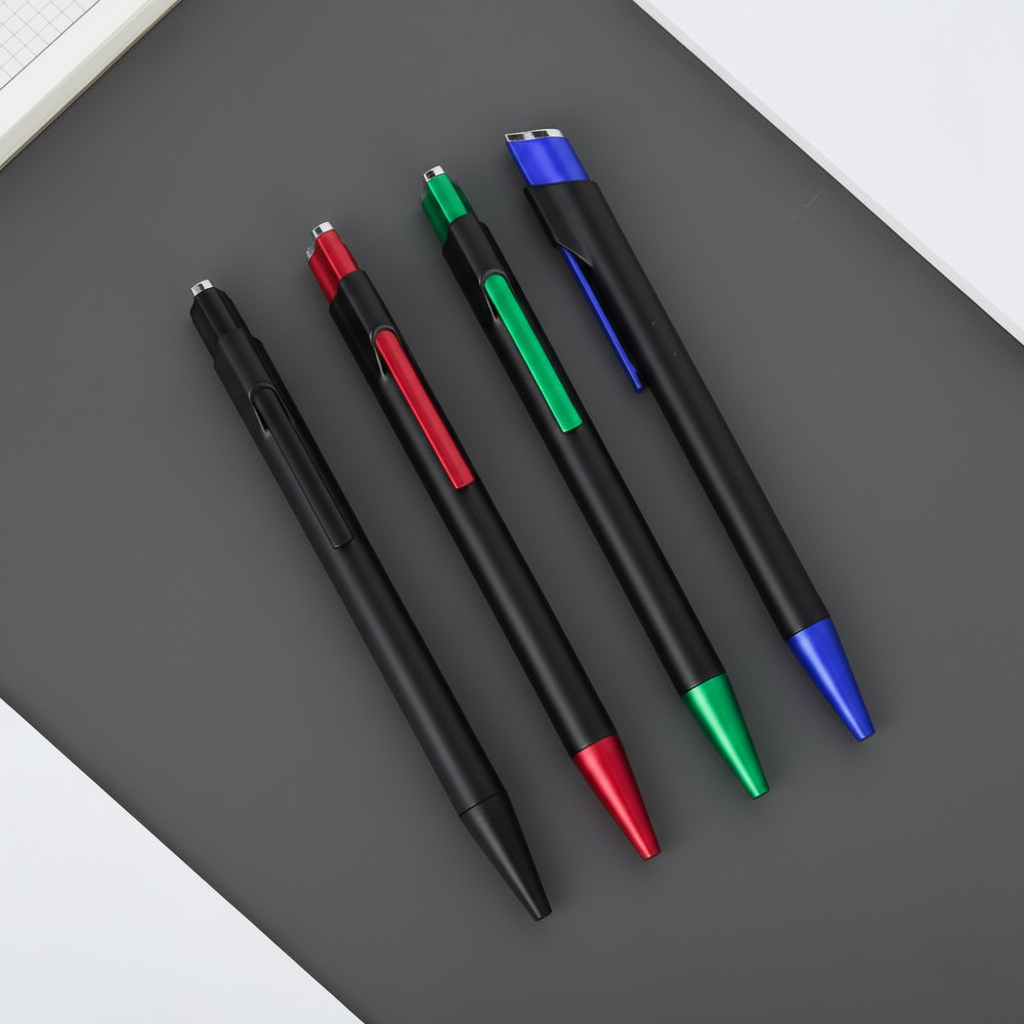 A reliable ball pen with a smooth click to write design, 1.0mm black ink, and a durable plastic casing. Ideal for everyday writing and promotional use.