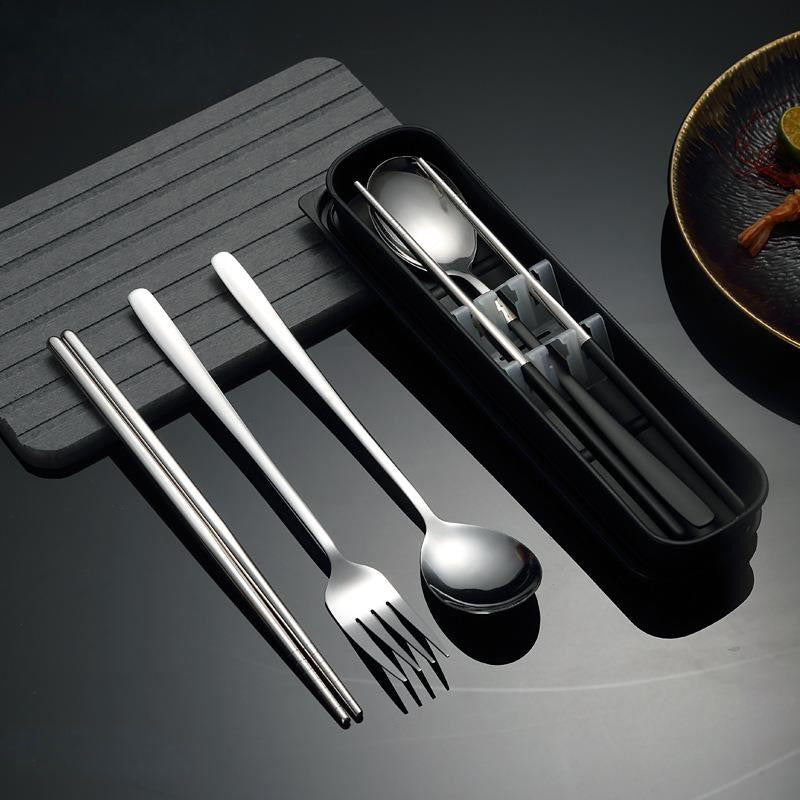 Sleek, eco friendly portable cutlery set with fork, spoon, and chopsticks in a durable travel case. Perfect for work, school, and outdoor dining.