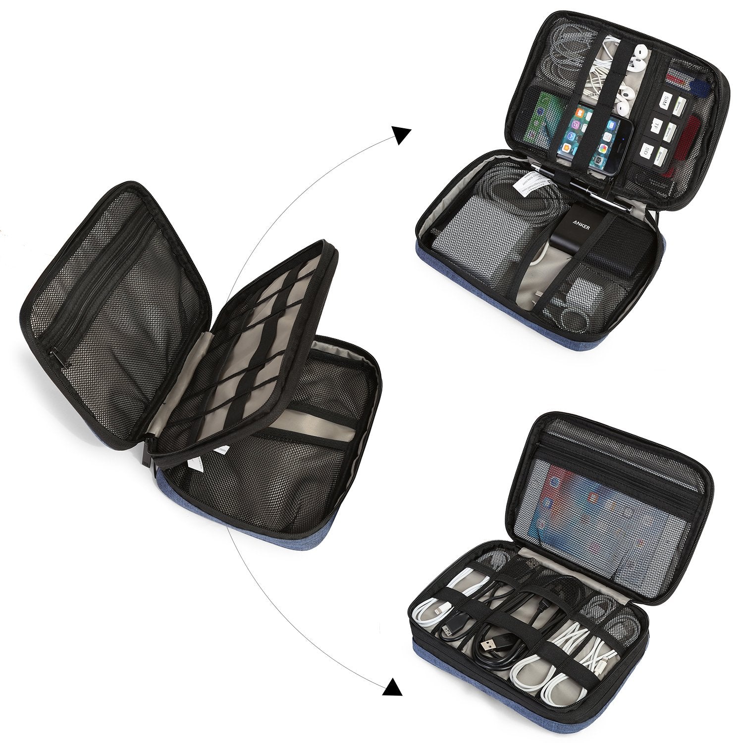 Lightweight double layer polyester organizer with padded protection, multiple mesh pockets, and elastic segments. Perfect for storing electronics and accessories.
