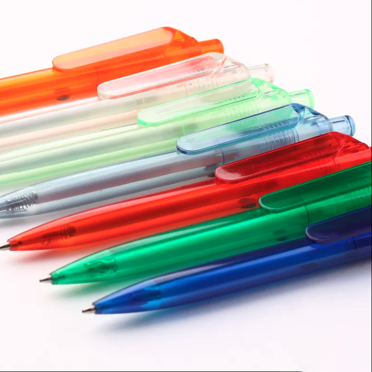 Eco-friendly push-action ballpen made from RPET, featuring a colorful transparent barrel, clip, and button. Smooth writing, sustainable style.