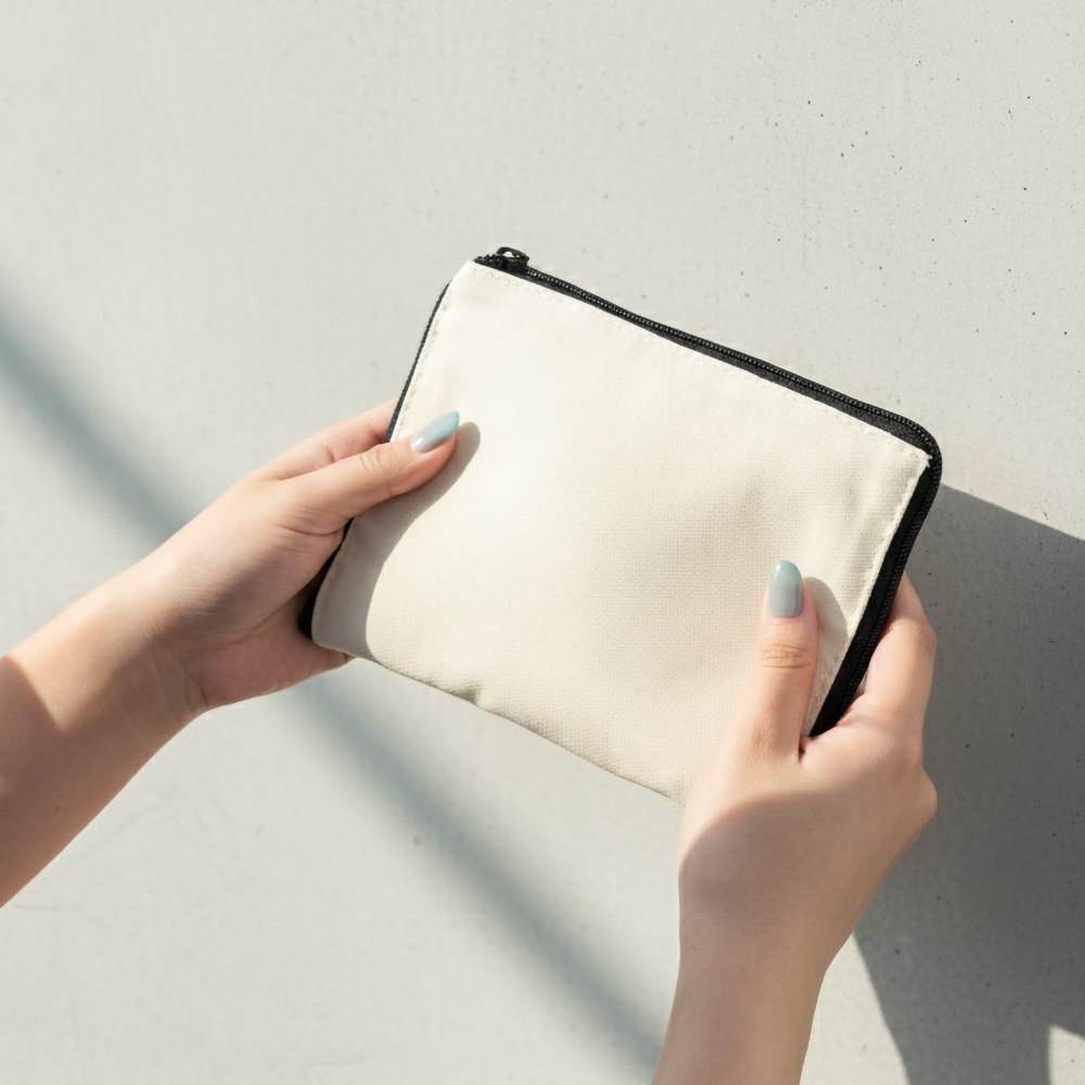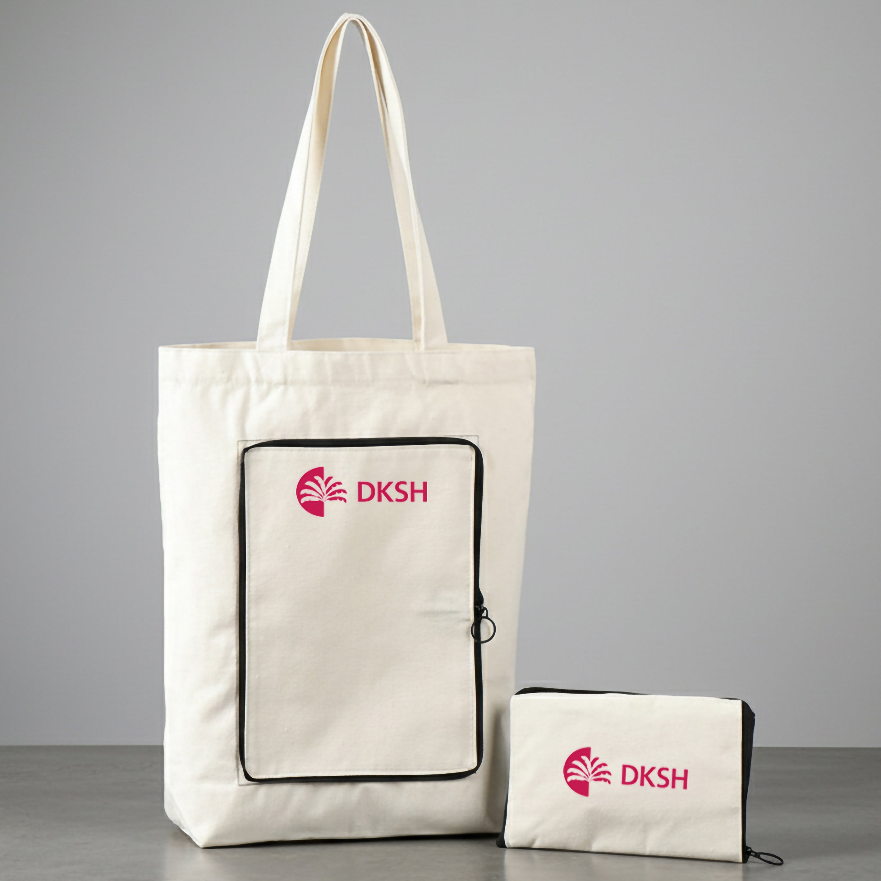 Eco friendly 8oz cotton tote bag folds into a compact zip pouch. Perfect for reusable shopping and promotional giveaways.