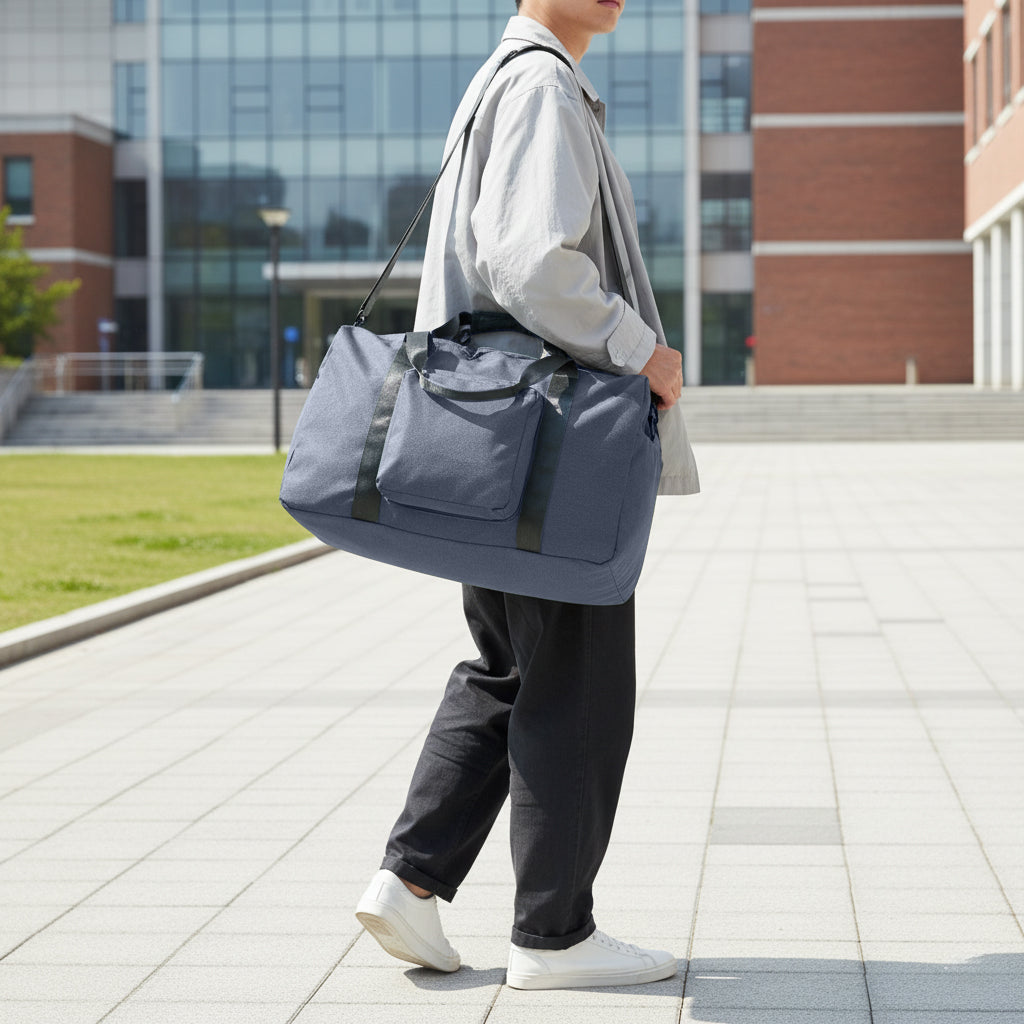 Lightweight and spacious foldable duffel bag with adjustable sling strap. Perfect for travel, sports, and shopping trips when you need extra packing space.