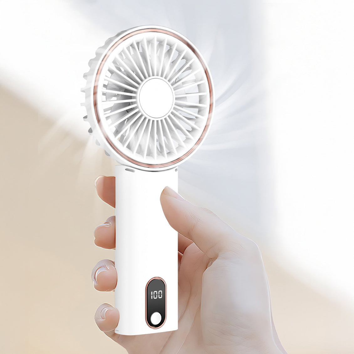 Compact, rechargeable fan with adjustable airflow, quiet operation, and versatile use handheld, desk, or neck worn.