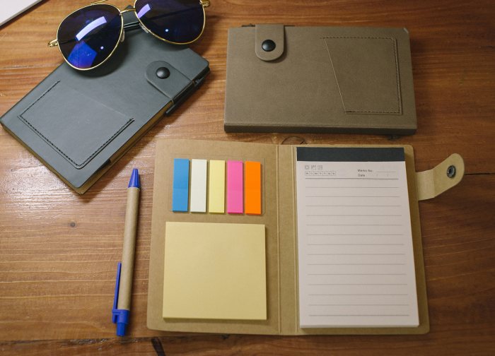 Stylish PU leather notebook set with lined memo pads, coloured post it pads, and pen. Perfect for notes, reminders, or corporate gifting.