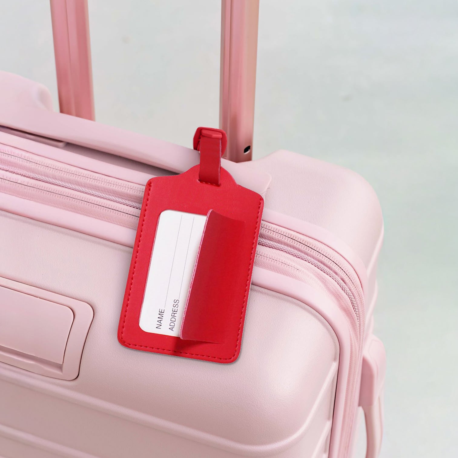 PU leather luggage tag with flap revealing personal information available in multiple vibrant colours for easy luggage identification.