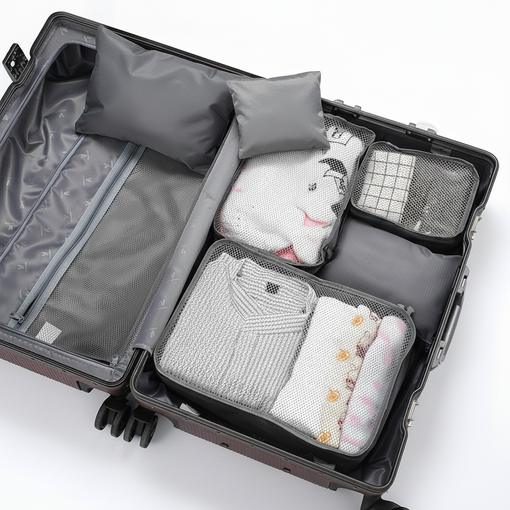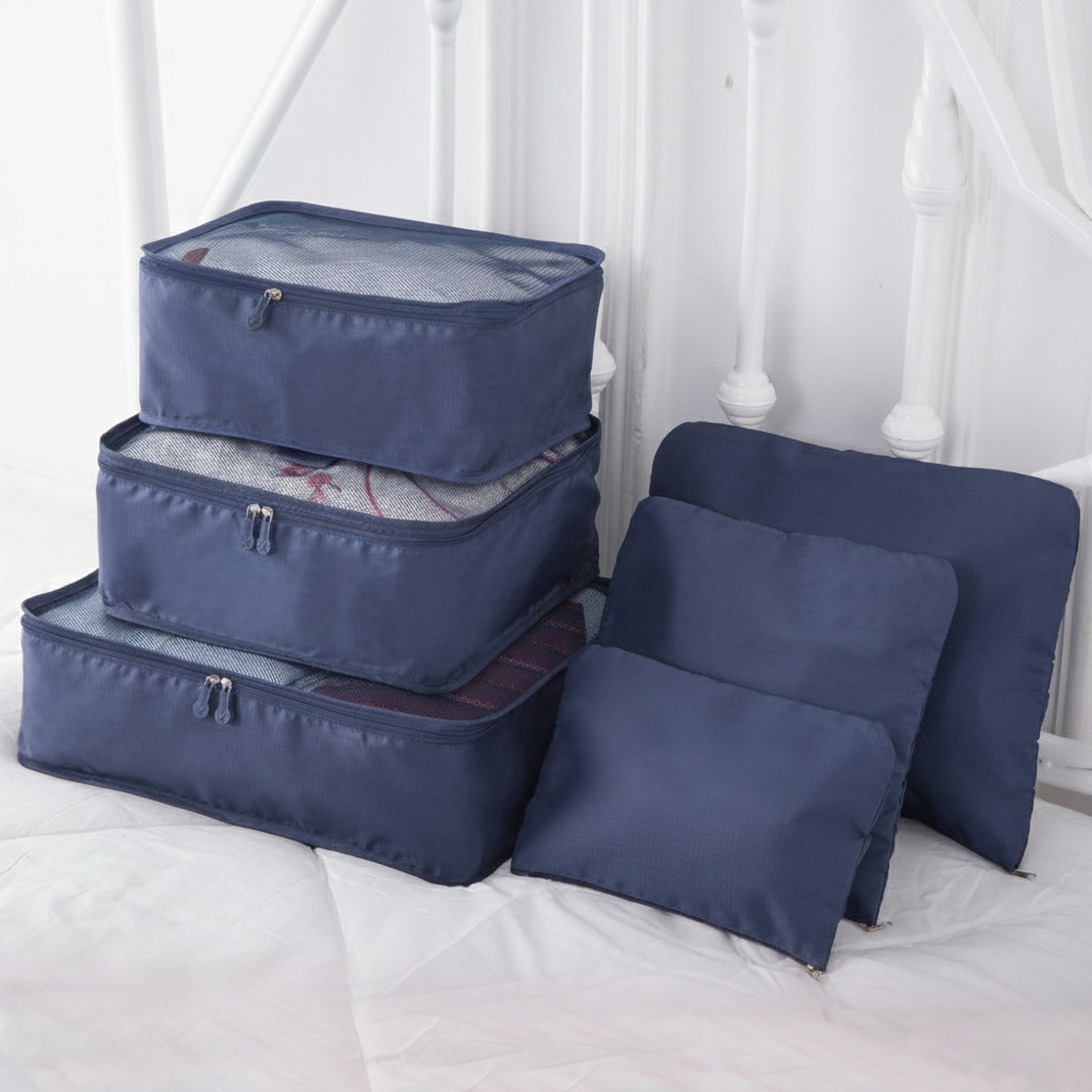 Maximize your luggage space with the Nava 6 in 1 Travel Luggage Organizer six water repellent packing cubes that keep clothing and essentials clean, organized, and compressed.