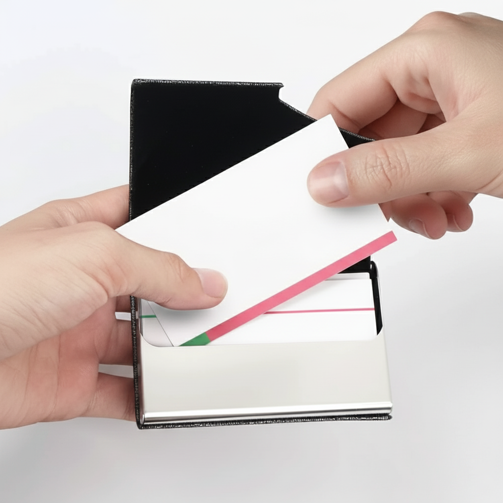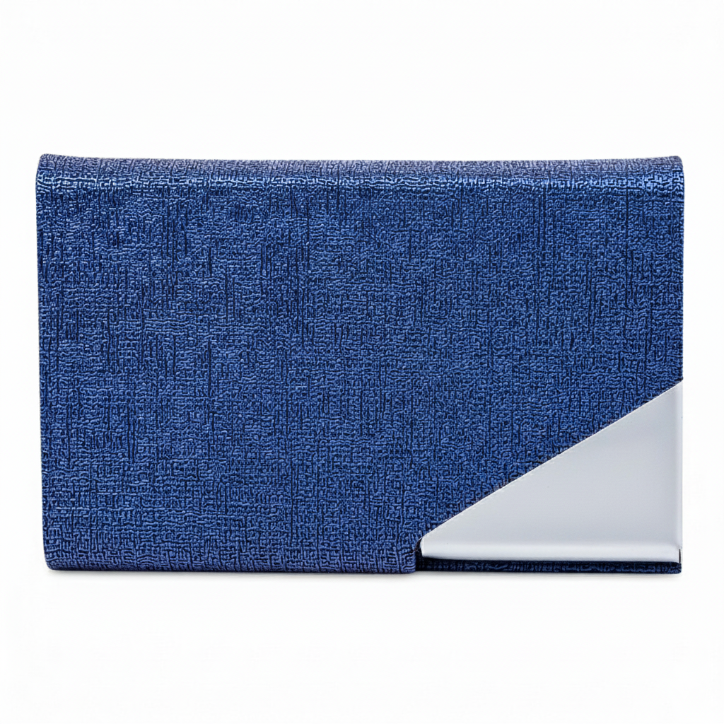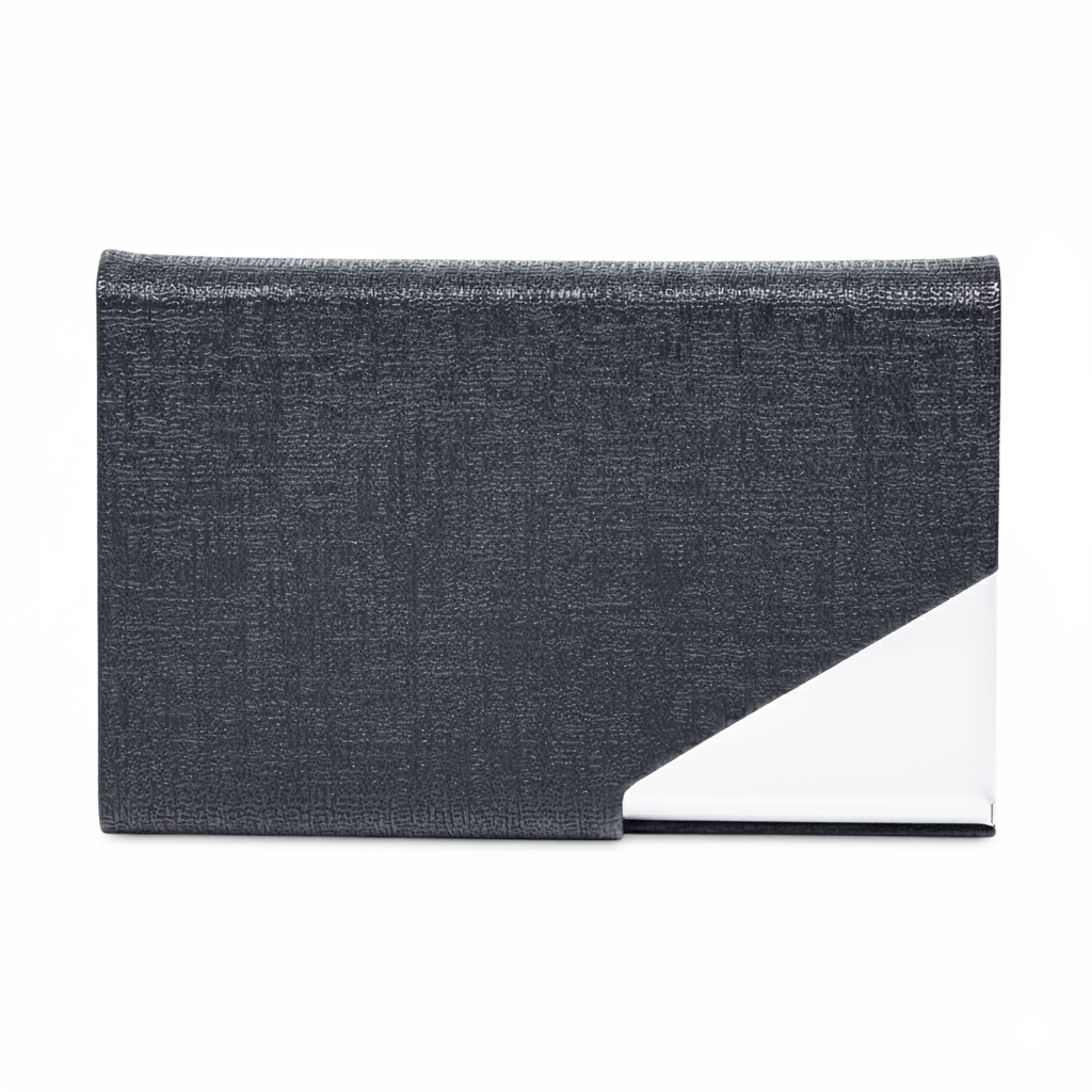 A sleek metal and PU leather name card holder with a magnetic closure.Designed for easy access, secure storage, and a professional look.