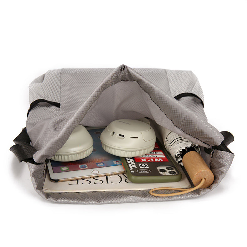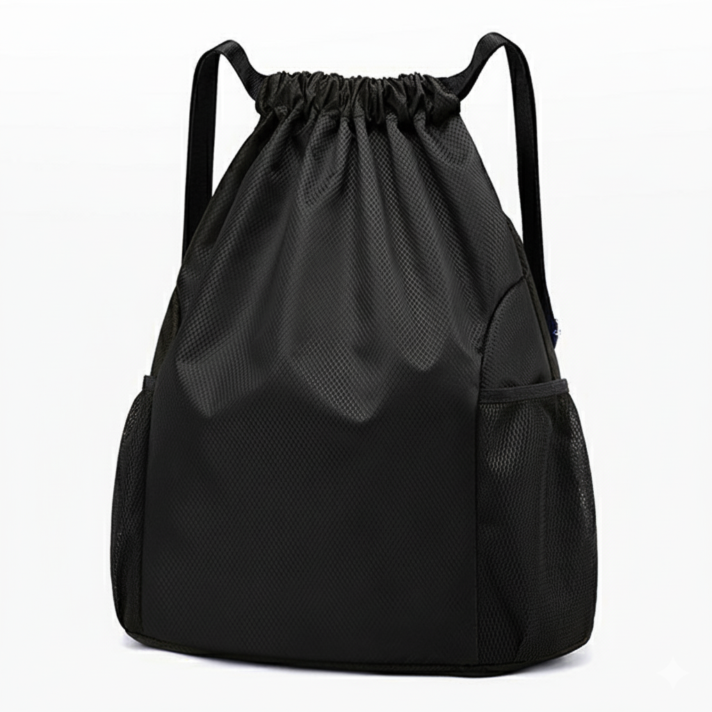 This durable, water-resistant ripstop drawstring backpack is ideal for travel or gym use. It offers spacious organization, an inner zip pocket, mesh side pockets, and comfortable wider straps.