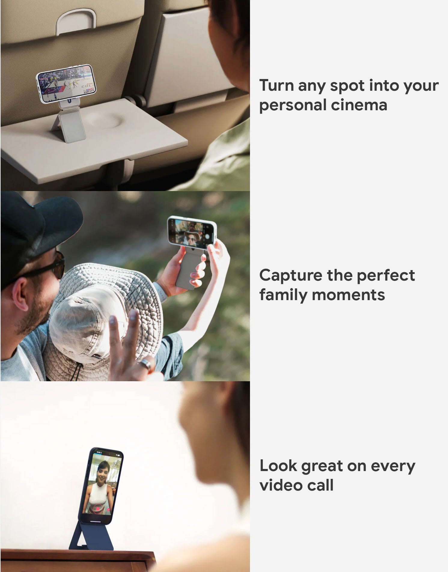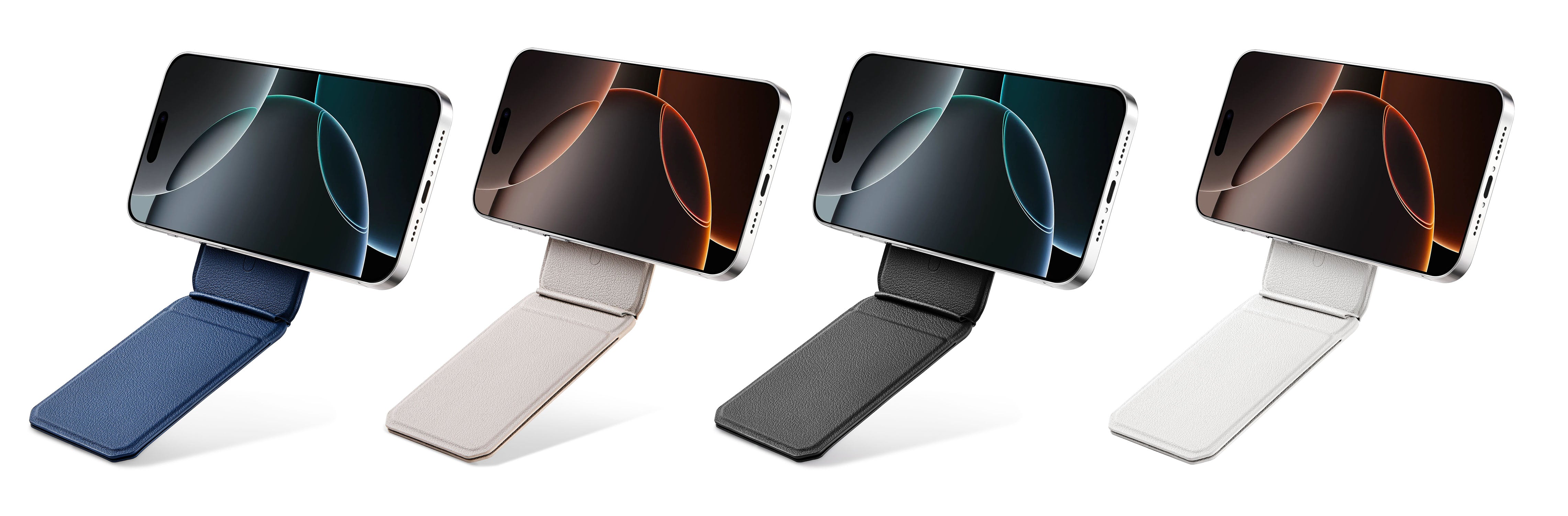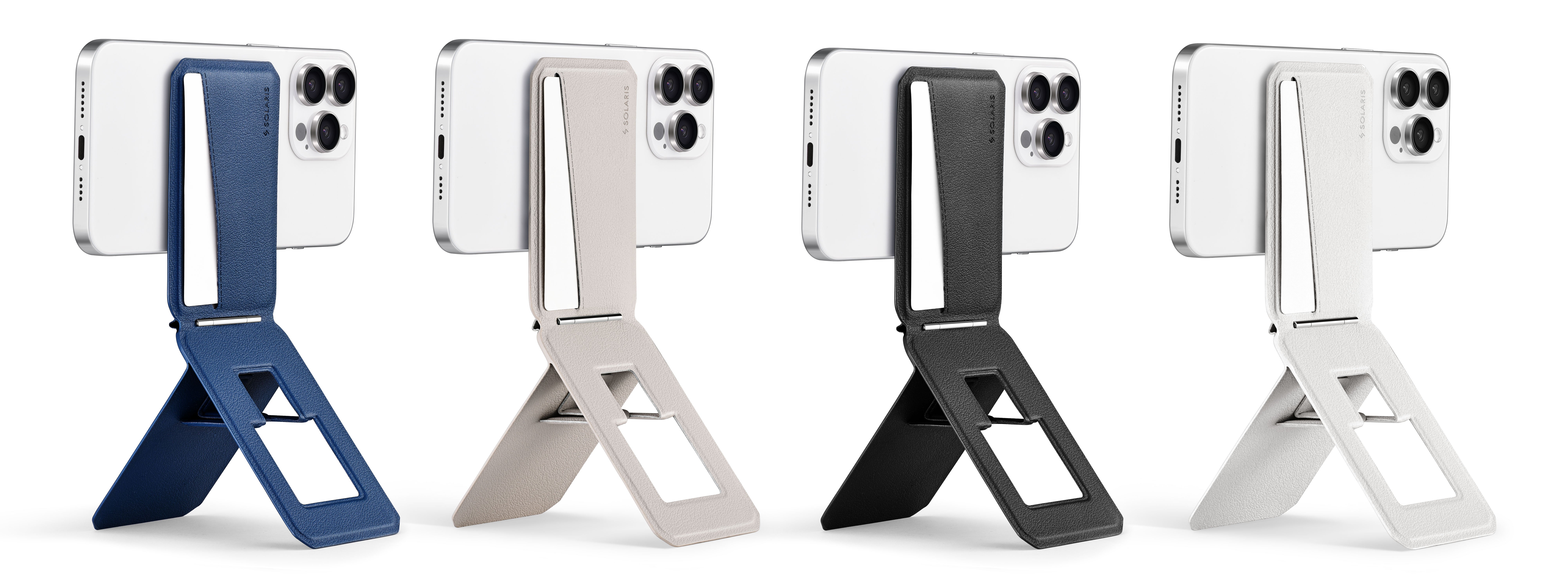 MagSafe-compatible 3-in-1 wallet, stand, and tripod. Holds cards securely and offers adjustable viewing angles for iPhone users.