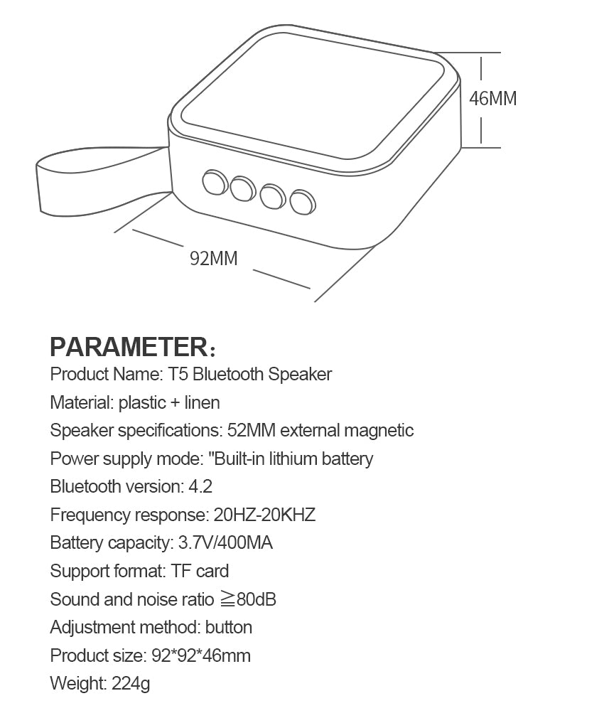 Compact and portable T5 Mini Bluetooth speaker with built in dual speakers, enhanced bass, and TF card support for an immersive audio experience.