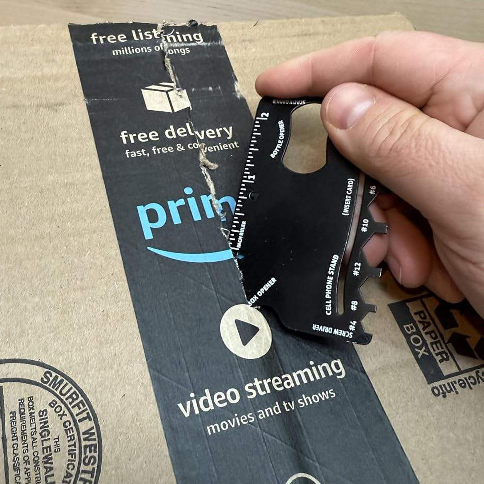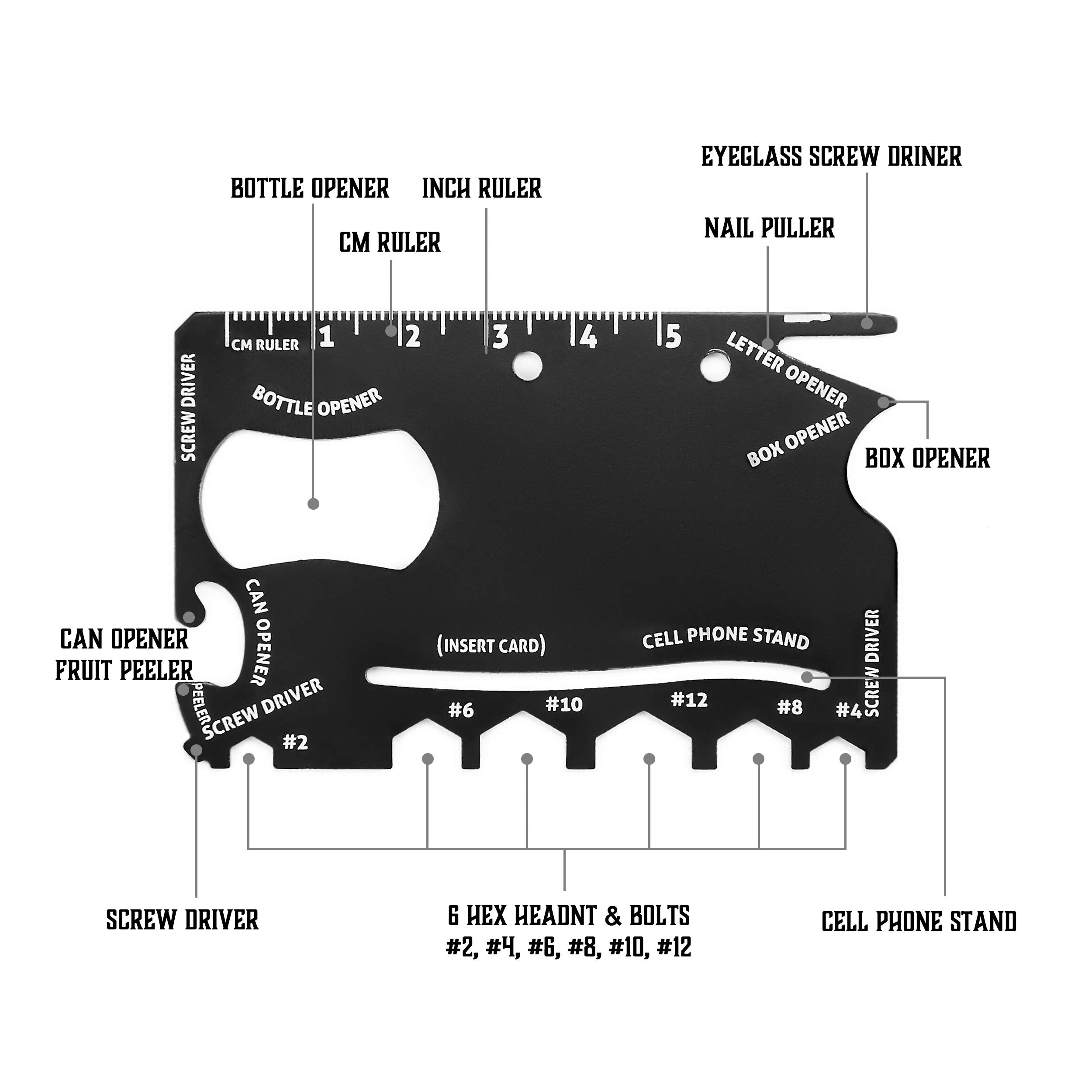 A compact, all in one wallet sized tool made from rust-resistant steel. Features screwdrivers, openers, a phone stand, and more for everyday convenience.